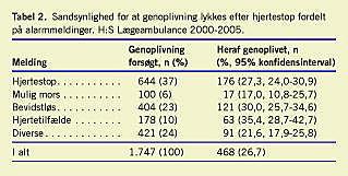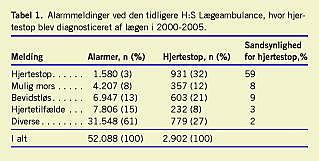 Resultater: Der var i alt 52.088 alarmmeldinger, og i 2.902 tilfælde blev der diagnosticeret hjertestop. Ca. 32% af alle hjertestop blev fundet hos patienter med alarmmeldingen »hjertestop«. 68% var meldt som noget andet, hvor »bevidstløs« udgjorde 21%. Hos 41% af patienterne med alarmmeldingen »hjertestop« kunne dette ikke bekræftes ved lægens ankomst.