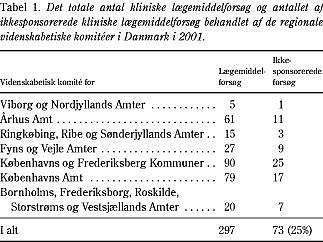 Opgørelsen er baseret på antal behandlede sager i 2001, hvor den anførte komité var primærkomité. I Tabel 1 vises det totale antal lægemiddelforsøg og antallet af ikkesponsorerede lægemiddelforsøg. De ikkesponsorerede lægemiddelforsøg vil typisk være forskerinitierede. Der er her udelukkende anført antal forsøg, og der skelnes således ikke mellem »små« forsøg med deltagelse af et enkelt forsøgscenter eller større nationale eller internationale multicenterforsøg.