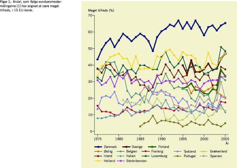 Danskerne er i særklasse, i hvert fald når det gælder tilfredshed med tilværelsen. Tidligere på året udsendte Leicester Universitet et »World Map of Happiness« med Danmark som en klar nummer 1. Og ikke nok med det, igennem de seneste 30 år har Danmark uden undtagelse ligget på førstepladsen i eurobarometerundersøgelserne [1]. Ifølge disse undersøgelser er mere end to tredjedele af danskerne »meget tilfredse« med deres liv. Intet andet eurobarometerland når tilnærmelsesvis dette niveau, og for de fleste af landene er andelen mindre end en tredjedel (Figur 1 ). For at finde en forklaring på den danske (selv)tilfredshed har vi gransket litteraturen, statistikken og den almene viden.