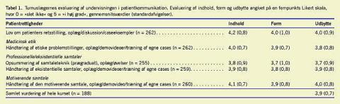 Der er i 2006-2007 afholdt i alt 18 kurser med 274 deltagere, hvor alle deltagere har afleveret evalueringsskema. Tabel 1 viser, at deltagerne evaluerede kursets fire emner/sessioner med en middelværdi på 3,7-4,2 på en skala fra 0-5, og den samlede vurdering af kurset blev evalueret til 3,9, hvoraf 79 procent af deltagerne scorede fire eller fem. Den største enighed blandt deltagerne ses i evalueringen af undervisningen i patienters retsstilling og etik, hvor henholdsvis 77 og 71 procent af deltagerne har scoret fire eller fem.