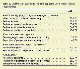 Svarene på de åbne spørgsmål er temat isk fremstillet iTabel 2 . Deltagerne fremhæver blandt andet udbyttet af undervisning i retsstillingsloven »at kende mine pligter og patientens rettigheder«. Heraf mente flere, at det var »godt med en repetition af lovgivningen«, og at kurset skulle »indeholde mere lovstof ... det er her og nu væsentligt, og bør altid være centralt i beslutningsprocessen«. Kun en enkelt deltager fandt, at lovstoffet kunne undværes fordi: »jeg havde meget godt styr på det fra studiet«. Med hensyn til etikken angav mange, at denne undervisningsdel var væsentlig og kunne fylde mere, fordi »etisk stillingtagen hjælper en til at definere sig selv som læge«. Mange fremhæver betydningen af at have fået »inspiration og kommunikative redskaber til at tackle professionelle samtaler«. Flere angav, at redskaberne »kan huskes og bruges i praksis«. Især fremhæves redskaberne til den motiverende samtale. Også mange fremhævede udbyttet af undervisningen i den eksistentielle samtale, »øget bevidsthed og refleksion« og »reduceret frygt for at tage samtalen«. Denne del af kurset blev dog også på grund af emnet anført som lang og tung af nogle.