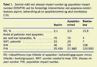 Begreberne illustreres i Tabel 1 , hvor konsekvenserne af forskellige interventioner ved apoplexia cerebri er anført. Den beskedne absolutte gevinst ved lavdosis aspirin (RD: 3,1%) og apopleksienheder (RD: 5,0%) over for trombolyse (RD: 15,9%) opvejes på befolkningsniveau af, at langt den overvejende del af alle patienter kan tilbydes Aspirin og behandling på en apopleksienhed, hvorimod kun ganske få opfylder kriterierne for trombolyse, hvorfor DIN/PIN bliver væsentligt højere end for aspirinbehandling.