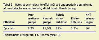 Forfatterne bliver nødt til at anføre (og redaktørerne nødt til at efterspørge) de absolutte antal udfald i interventions- og kontrolgrupperne med angivelse af både AR, RR, RD og NNT, NNH eller NNS med angivelse af konfidensintervaller omkring de pågældende effektmål [20, 21]. Resultaterne kan f.eks. opstilles som anført i Tabel 2 . For patienter med en kronisk lidelse vil forlængelse af den sygdomsfri overlevelse formentlig være den lettest forståelige parameter.