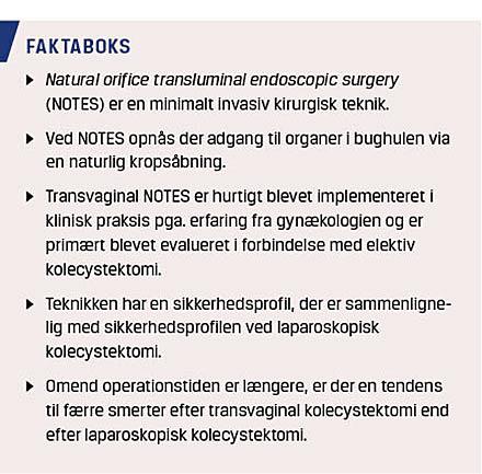Natural orifice transluminal endoscopic surgery (NOTES) is a minimally invasive surgical technique where access to the abdominal cavity is achieved through one of the natural orifices of the body. Based on experience from gynaecology, transvaginal access has been the easiest NOTES technique to implement in clinical practice. As was the case with laparoscopy, transvaginal NOTES has primarily been evaluated for cholecystectomy. Although the evidence is limited, the data support a safety profile comparable to that of laparoscopy. As for potential benefits, further research needs to be conducted.