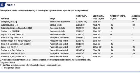 I flere studier har man rapporteret om signifikant færre smerter målt på en visuel analog skala eller numerisk rangskala efter TV-kolecystektomi end efter laparoskopisk teknik (Tabel 2). I enkelte studier har man påvist nedsat brug af smertestillende medicin postoperativt TV-kolecystektomi (Tabel 2). Evidensen fra de enkelte studier er mangelfuld pga. studiernes størrelse og design. Metaanalyser understøtter lavere postoperativ smerte og analgetikaforbrug efter TV-kolecystektomi end efter laparoskopi [17, 18].