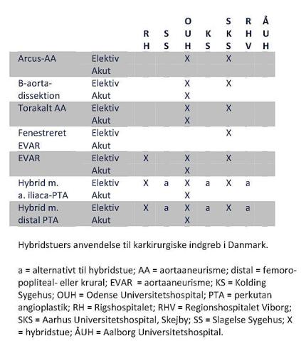 I tabellen ses, hvilke hospitaler der i dag råder over hybridstuer. Det efterlader dog de ikkebesiddende hospitaler med et ringere behandlingstilbud. F.eks. har man på Slagelse Sygehus kreativt tilført den største operationsstue en generator, så man kan udføre arteriografi a.m. Seldinger. De øvrige steder bruges en C-bue til endovaskulær intervention på operationsstue ved hybridprocedurer.