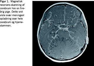 En tidligere rask toårig pige blev indlagt med symptomer på forhøjet intrakranialt tryk som opkastninger, træthed og let usikker gang. En magnetisk resonans (MR)-skanning af cerebrum viste kommunikerende hydrocefalus, hvorfor hun fik indopereret en ventrikuloperitoneal shunt. Som bifund blev der konstateret diskret opladning ved basis cranii og øget signal periventrikulært.