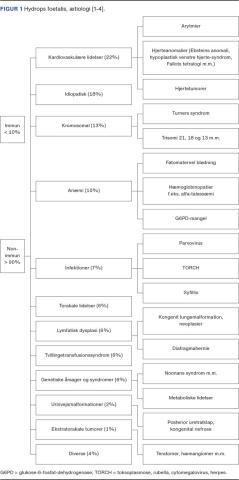 Ætiologisk inddeles HF traditionelt i immun (IHF) og nonimmun HF (NIHF), hvilket er grundlaget for struktureringen af denne artikel (Figur 1). IHF skyldes maternel erytrocytalloimmunisering, som medfører hæmolytisk anæmi hos fosteret pga. transplacentært overførte maternelle antistoffer rettet mod føtale erytrocytantigener (oftest rhesus (Rh)-immunisering). Fosteret bliver anæmisk og kan udvikle kardiel inkompensation og derved ledsagende IHF. Forekomsten af IHF er faldet betragteligt i Danmark som følge af, at man i 1969 indførte Rh-profylakse samt systematisk screening af Rh-negative gravide. NIHF udgør nu over 90% af tilfældene med HF [5], og en alternativ inddeling i anæmisk og nonanæmisk HF er foreslået, da den synes mere anvendelig i den ætiologiske udredning [6].