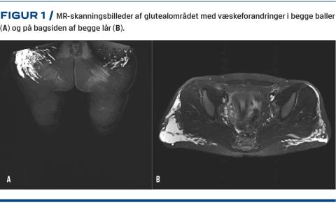 Hun blev henvist til MR-skanning, hvor man påviste væskeansamlinger i begge baller og på bagsiden af begge lår (Figur 1). Der blev rejst mistanke om, at der skulle være kunstigt materiale som for eksempel silikone til stede, hvorfor man anbefalede supplerende CT af thorax og abdomen. Konfronteret med ovenstående MR-skanningsfund oplyste hun, at hun tidligere havde fået ilagt brystimplantater, men at der angiveligt ikke skulle være lækage fra disse.