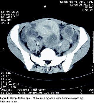 En 14-årig, tidligere rask pige henvistes akut af en vagtlæge til en kirurgisk afdeling på mistanke om nyrelæsion. Pigen var fire dage forinden faldet på sengekanten, hvor hun slog halebenet. Den følgende dag fik hun smerter i epigastriet og højre flanke. Smerterne tiltog betydeligt over de næste dage på trods af analgetisk behandling, hvorfor pigen opsøgte vagtlægen. Denne konstaterede mikrohæmaturi og fandt patienten smertepåvirket og klamtsvedende. Ved indlæggelsen klagede pigen foruden smerter over kvalme. Der var normal afføring. Ingen dysuri eller opkastning. Pigen havde ikke haft menarche. Objektivt fandtes hun febril, 38,8° C. Hun var diffust øm i abdomen og over begge nyreloger, og man bemærkede en palpapel udfyldning over symfysen. Der var veludviklede mammae og normal kvindelig pubesbehåring. C-reaktivt protein var 202 mg/l, leukocytter 9,3 × 10 9 /l, serumkreatinin 71 mmol/l. På mistanke om organlæsion som årsag til symptombilledet blev der foretaget akut computertomografi (CT) af abdomen. Denne udførtes med peroral og intravenøs kontrast med leveren i portokaval fase og viste massiv haematometra og haematokolpos, venstresidig hydronefrose og hydroureter samt en mindre væskeansamling intraperitonealt (Figur 1 ). På mistanke om HI overførtes pigen herefter til en gynækologisk afdeling, hvor man ved inspektion bekræftede diagnosen. På grund af den perorale kontrast, valgte man ikke at operere akut og foretog i stedet en lille incision i hymen, hvorved der udtømtes 500 ml gammelt blod. Man påbegyndte antibiotisk behandling, og pigen blev opereret dagen efter i fuld anæstesi, hvor introitus dilateredes til tre fingre. Podning fra vagina samt dyrkning af blod og urin var uden vækst. Pigen blev udskrevet afebril og velbefindende to døgn efter. Ved ambulant kontrol tre måneder senere var hun velbefindende og havde fået regelmæssige menstruationer. Ved en abdominal ultralydskanning (UL) fandtes normale forhold i genitalia interna.