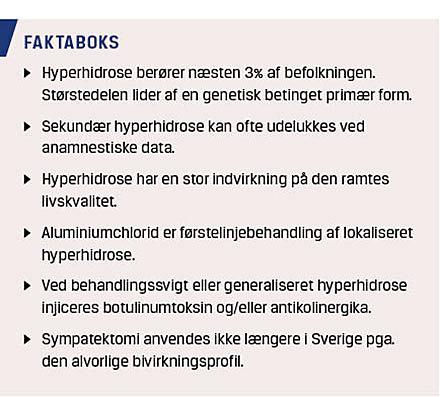 Hyperhidrose er en almindelig sygdom, der ofte undervurderes af sundhedsvæsenet, på trods af de store lidelser den forårsager for patienterne. Med denne artikel ønsker vi at øge kendskabet til hyperhidrose og vise, at mange danske patienter lider unødigt, da der findes gode behandlinger med blandt andet botulinumtoksin, som, baseret på forskningsresultater, internationalt har en helt anden plads i behandlingsrekommandationer end i Danmark.