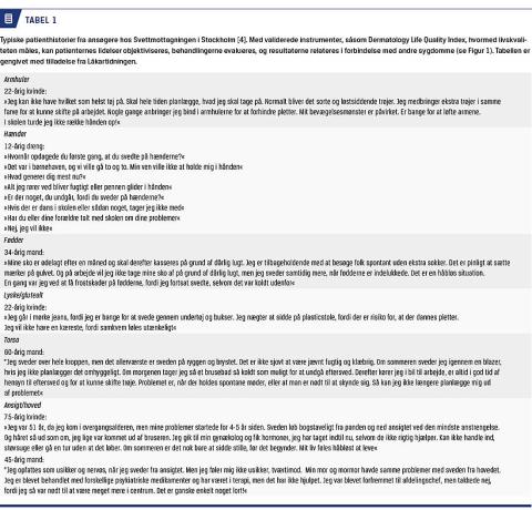 Hyperhidrose er, uanset genese, en tilstand, som har stor indvirkning på den ramtes livskvalitet. Læger har ofte utilstrækkelig viden om hyperhidrose og mangler derfor værktøjer til at håndtere patienternes angst og lidelse. Eksempler på almindelige historier fra patienter med forskellige former for hyperhidrose er præsenteret i Tabel 1.
