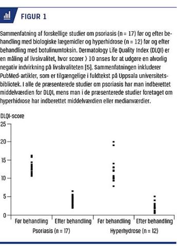 Vha. validerede skalaer såsom bl.a. Dermatology Life Quality Index (DLQI) kan patienternes livskvalitet objektiviseres og sammenlignes med livskvaliteten hos patienter med andre hudsygdomme. Sådanne sammenligninger viser, at patienter med hyperhidrose ofte har en livskvalitet, der kan sammenlignes med livskvaliteten hos dem, der er hårdest ramt af psoriasis og berettiget til behandling med biologiske lægemidler (Figur 1).