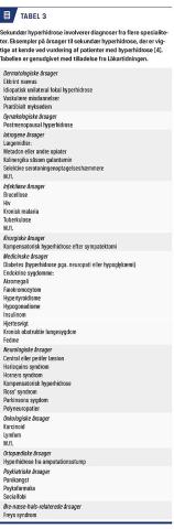 En række sygdomme, der involverer mange forskellige specialer, kan også forårsage overdreven svedtendens, som kaldes sekundær hyperhidrose (Tabel 3). Generaliseret hyperhidrose kan f.eks. forårsages af malignitet, infektion eller endokrine sygdomme, men patienterne har normalt også andre symptomer såsom vægttab, træthed, tilbagevendende feber, hjertebanken, nattesved osv.