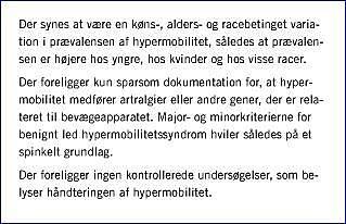 I to undersøgelser har man dog ikke fundet nogen køns-forskel [2, 8]. I sidstnævnte arbejde var grænsen for hypermobilitet imidlertid sat til ≥6 positive test ud af 9.