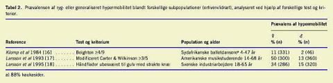 Det kunne desuden se ud som om, at der er højere prævalens af hypermobilitet - vurderet ud fra kriteriet ≥4/9 af Beightons test - blandt arabere, afrikanere, inuitter og nordamerikanske indianere end blandt kaukasider og maorier, men de undersøgte populationer er ikke helt alderssammenlignelige (Tabel 1).