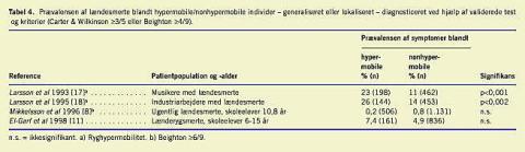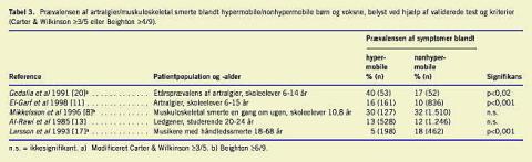 Kirk et al beskrev, at 20 ud af 24 generelt hypermobile patienter med muskuloskeletal smerte havde ledsmerter [19]. Hos tswanaafrikanere fandtes en relativ høj korrelation mellem hypermobilitetsscore (0-9) og et primitivt muskuloskeletalt smertescore (0-4) - inklusive ledsmerter [3]. Dette støttedes ikke af andre, som efter justering for alder ikke fandt nogen korrelation mellem ledsmerter og hypermobilitetsscore hos yorubaafrikanere [7]. Resultaterne fra senere undersøgelser over artralgiprævalensen hos hypermobile er ikke entydige (Tabel 3 ). Det skal dog nævnes, at hvis kriteriet for hypermobilitet blev sat til Beighton-score ≥7/9 fandt man i et af arbejderne [13] en signifikant øget prævalens af ledgener.