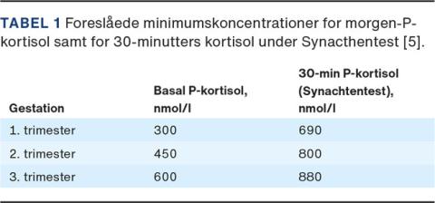 Hos patienten i denne sygehistorie var det kombinationen af hyperpigmentering, symptomer og autoimmune manifestationer (anti-TPO-positiv hypotyroidisme og formodet perniciøs anæmi), der ledte til mistanken om primær binyrebarkinsufficiens. Biokemisk vurdering af hypothalamus-hypofyse-binyre-aksen under graviditet er kompliceret af den østrogeninducerede forhøjelse af cirkulerende kortisolbindende globulin, der resulterer i misvisende høje cirkulerende kortisolniveauer [4]. Der er udfærdiget en tabel med korrigerede P-kortisolniveauer under de tre trimestre af graviditet (Tabel 1), men denne patients basale P-kortisolniveau faldt bemærkelsesværdigt inden for normalområdet, til trods for at hun havde binyrebarkinsufficiens. Måling af P-ACTH er normalt reserveret til bestemmelse af årsagen til binyrebarkinsufficiens. Forhøjet P-ACTH under graviditet understøttede imidlertid mistanken om primær binyrebarkinsufficiens (som det gjorde sig gældende i denne case, hvor P-ACTH var næsten ti gange højere end den øvre grænseværdi), idet P-ACTH-niveauet forbliver inden for normalområdet i den normale graviditet.