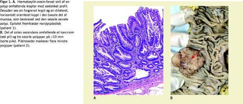II. En 69-årig kvinde fik hæmatokesi og vægttab. Ved kolonskopi påvistes en tumor i caecum og tre polypper i transversum. Histologisk undersøgelse viste karcinom i caecum og i den ene polyp, de øvrige polypper var opbygget af KA med overgang i SSP. Både karcinom og adenom viste manglende ekspression for MLH1, men normal ekspression for MSH2 og MSH6. Områder med SSP viste derimod normal immunekspression. Der blev efterfølgende foretaget en højresidig kolektomi. Denne omfattede fire slimproducerende karcinomer. I et af karcinomerne påvistes overgang i SA og mindre foci af SSP. Herudover omfattede præparatet syv polypper, hvoraf tre målte > 10 mm (Figur 1B) og omfattede en blanding af traditionel HP, SSP og SA tillige med fokale komponenter af KA.