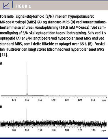 Med klinisk anvendt MRS er der naturligvis en nedre grænse for, hvilke molekylekoncentrationer der kan bestemmes inden for en rimelig skanningstid. Ved hyperpolariseret MRS øges følsomheden med en faktor over 10.000 (Figur 1) [11]. Bestemte atomer i biologisk aktive molekyler mærkes (hyperpolariseres) og kan indgives intravenøst. Disse molekyler, hvor udvalgte atomer er hyperpolariserede, defineres som bioprober. Sensitiviteten i hyperpolariseret MRS afhænger af flere faktorer, såvel den specifikke metaboliske aktivitet som koncentrationen af den anvendte bioprobe. Afhængigt af hvilke kulstofatomer i et givet molekyle man polariserer, kan man kvantitativt bestemme produkter fra forskellige nedbrydningsveje. Polariseringen finder sted uden for MR-skanneren i en polarisator, hvor en given atomkerne, f.eks. 13C, i det aktive molekyle hyperpolariseres med mikrobølgebestråling ved en temperatur nær 1 grad Kelvin.