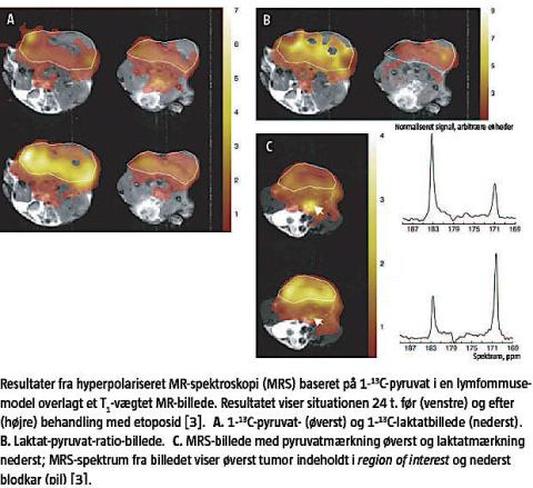 Hyperpolariseret MRS baseret på f.eks. 13C-pyruvat har med held været anvendt til tumorgraduering i eksperimentelle modeller for prostatacancer. De kvantitative mål for pyruvats nedbrydningsprodukter kan sammenstilles således, at de korrelerer med malignitetsgraden [1]. Senest har man fra University of California publiceret de første kliniske studier, hvori der indgår patienter med prostata [2]. Her er påvist en tidlig og anatomisk mere detaljeret diagnostik af human prostatacancer, hvilket ikke var muligt med andre metoder. De involverede patienter havde med andre metoder fået påvist unilateral cancer, hvor man med hyperpolariseret MRS kunne påvise bilateral cancer hos flere. I andre studier har man for nylig påvist en signifikant øget hyperpolariseret laktatproduktion i en lymfommusemodel og i human glioblastom-xenograftmodeller, og det blev konkluderet, at hyperpolariseret MRS har potentiel klinisk betydning i prognose og monitorering af den terapeutiske respons i behandlingen af cancer [3, 4]. Med hyperpolariseret 13C-pyruvat er der hos rotter med implanterede humane glioblastomceller påvist en signifikant reduktion i laktat-pyruvat-forholdet efter behandling med temozolomid [5]. Lignende terapeutiske studier, der beror på associeringen mellem malign transformation og stigende glykolyse med forøget intracellulær laktat, er blevet foretaget med andre eksperimentelle dyremodeller. F.eks. har man i et nyligt publiceret præklinisk studium fundet, at injektion af hyperpolariseret 13C-pyruvat var anvendelig til belysning af den positive effekt af combretastatin-A4-fosfat (målrettet mod angiogenesen) på tumorvæksten hos en mus med subkutant inokulerede lymfomceller [6].