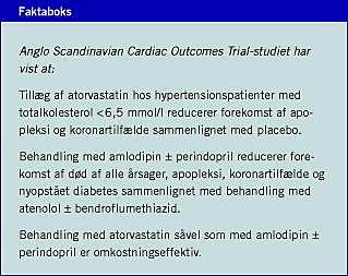 ASCOT-LLA [2] blev stoppet før tid efter en gennemsnitlig opfølgningstid på 3,3 år, idet der på dette tidspunkt var 100 kardiovaskulære tilfælde i den statinbehandlede gruppe og 154 tilfælde i den placebobehandlede gruppe (p = 0,0005). Der var signifikant reduktion af såvel apopleksi som koronarsygdom. Ved den afsluttende kontrol var totalkolesterol reduceret med 1,1 mmol/l hos den aktivt behandlede gruppe sammenlignet med hos placebogruppen. En sundhedsøkonomisk analyse viste, at statinbehandling af denne patientgruppe var omkostningseffektiv med en udgift på ca. 90.000 kr. pr. sparet kardiovaskulære tilfælde [3]. Med udgangspunkt i denne del af studiet anbefales det i den europæiske rekommandation for hypertension [4], at man overvejer behandling med statin hos hypertensionspatienter, der har høj risiko for kardiovaskulær sygdom, selv om deres kolesterolniveau ikke er forhøjet.