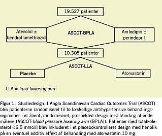ASCOT var tilrettelagt med henblik på at teste to hypoteser. Den første hypotese var, at mere tidssvarende antihypertensiva ville være bedre til at forbygge koronar hjertesygdom end de ældre lægemidler (ASCOT-blood pressure lowering arm (BPLA) [1]). Den anden hypotese var, at tillæg af et statin i lav dosis til patienter med hypertension og moderat øget kardiovaskulær risiko ville give en ekstra beskyttelse mod kardiovaskulær sygdom sammenlignet med placebo (ASCOT-lipid lowering arm (LLA) [2]). Det samlede studie omfattede 19.257 patienter fra de britiske øer og de nordiske lande, og af disse indgik 10.305 patienter med totalkolesterol under 6,5 mmol/l i ASCOT-LLA (Figur 1). Alle patienter skulle ud over hypertension have mindst tre yderligere kardiovaskulære risikofaktorer. De hyppigste risikofaktorer var mandligt køn og alder over 55 år, hvilket resulterede i, at 77% af patienterne var mænd, og at gennemsnitsalderen var 63 år (standarddeviation: 8,6 år). Godt 80% var i antihypertensiv behandling ved inklusionen, og hovedparten var overvægtige (gennemsnitligt body mass index: 28,7), mens kun en tredjedel var rygere. Type 2-diabetes forekom hos 27%, og 22% havde tegn på kardial belastning i form af hypertrofi af venstre ventrikel.