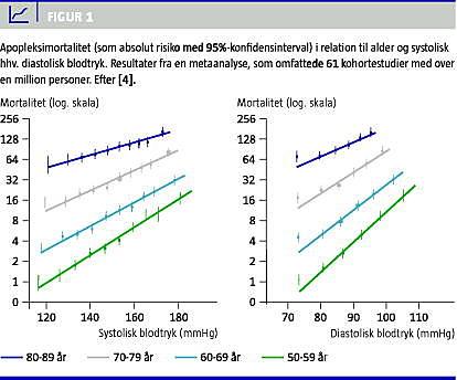 Hypertension eller forhøjet blodtryk er den vigtigste modificerbare risikofaktor for udvikling af kardiovaskulære sygdomme, såvel iskæmisk hjertesygdom som cerebro-vaskulær sygdom og nyresygdom. World Health Organisation anfører, at over 50% af alle slagtilfælde kan tilskrives et for højt blodtryk [1-5]. På verdensplan er det beregnet, at knapt otte millioner mennesker dør hvert år på baggrund af for højt blodtryk. Hovedparten af dette store antal præmature dødsfald bæres af lavindkomst- og middelindkomstlande, specielt i Latinamerika, Afrika og Østasien [2, 3]. På trods heraf får hovedparten af de, som efter gældende kliniske retningslinjer anbefales det, ingen antihypertensiv behandling. Dette er tilfældet, selv om omfattende epidemiologiske data viser, at for hver 2 mm fald i systolisk blodtryk i befolkningen, reduceres risikoen for død af slagtilfælde med 10% (Figur 1 ) og for død af iskæmisk hjertesygdom med 7%. Hvis blodtrykket nedsættes med 20/10 mmHg, halveres risikoen for apopleksi [4]. Effektiv forebyggelse, opsporing og tilstrækkelig behandling af forhøjet blodtryk er derfor en yderst vigtig sundhedspolitisk målsætning.