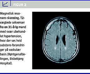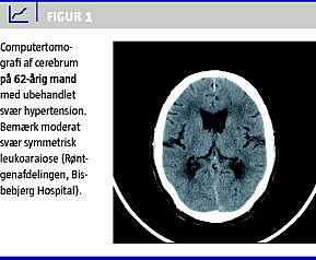 Hypertension medfører en acceleration i udviklingen af aldersinducerede forandringer i hjernens hvide substans, såkaldt leukoaraiose [2]. Disse forandringer kan ses på computertomografi (CT) og magnetiske resonans-skanninger (Figur 1 og Figur 2 ). Forandringerne er af iskæmisk natur og skyldes hypoperfusion i mindre kar, der medfører en udtynding af vævet. Hjernen er yderst følsom for øgning i blodtryksniveauet, og selv få mmHg's øgning i blodtryksniveauet i en døgnblodtryksmåling kan relateres til øget forekomst af hvid substansforandringer og øget hjerneatrofi efter bare få års observationstid [3]. Ud over alder og hypertension bidrager lakunære infarkter, rygning og hyperkolestrolæmi til udvikling af hvid substans-forandringer, idet disse faktorer også fører til iskæmisk cerebrovaskulær sygdom. Personer med hvid substans-forandringer har en øget risiko både for at få apopleksi og udvikle demens.