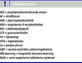 Endvidere er det fundet, at behandling med angiotensin II-receptorblokker (ARB) (losartan) (Figur 1 ) giver yderligere 15% reduktion i venstre ventrikelhypertrofi i forhold til betablokade/diuretika med næsten samme brakiale blodtryksreduktion [7]. I kliniske retningslinjer anbefales reduktion af venstre ventrikelmasse med enten angiotensinkonverterende enzym (ACE)-hæmmere, ARB og calciumkanal-blokkere og muligvis også aldosteron-antagonister [1].