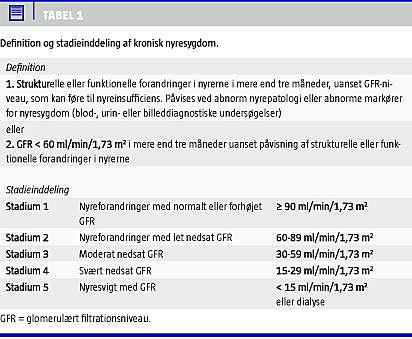Mange patienter med essentiel hypertension har kronisk nyresygdom i stadium 1 eller 2 (Tabel 1 ) med mikroalbuminuri og normal eller let forhøjet plasmakreatinin. Ubehandlet progredierer nyresygdommen, og de kliniske manifestationer svarer til kronisk nyreinsufficiens i stadium 3, 4 eller 5 hos ca. 20%, og ca. 40% af patienterne udvikler tiltagende proteinuri, sædvanligvis i non-nefrotisk niveau. Forløbet inddeles i en mild form (benign nefrosklerose) og en mere aggressiv forløbsform (malign nefrosklerose). Ved effektiv antihypertensiv behandling undgås de fleste tilfælde af klinisk betydende nefrosklerose.