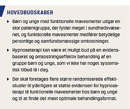 Hidtil har psykologiske behandlingsmetoder, som kognitiv adfærdsterapi (KAT) og hypnoseterapi (HT), vist de mest lovende resultater som behandling af denne patientgruppe. I denne artikel gives en status over den nuværende viden om effekten af HT-behandling ved FAP og IBS hos børn og unge.