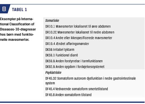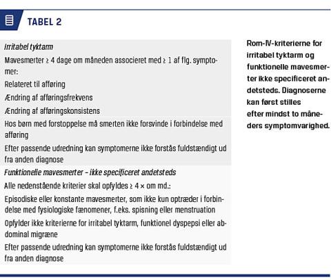 søgelser, hvoraf mange kan være overflødige og belastende for barnet [14]. For nuværende er IBS, men ikke FAP, en selvstændig diagnose i det internationale klassifikationssystem, International Classification of Diseases (ICD-10), der anvendes i Danmark. Børn og unge med FAPD får derfor forskellige og ofte mere uspecifikke diagnoser (Tabel 1) [15]. Mangel på enighed mht. brug af diagnoser er problematisk, da det bliver vanskeligt at få et overblik over omfanget af lidelserne og udvikle et systematisk behandlingstilbud. I klinisk praksis benyttes internationalt i tiltagende grad Rom-kriterierne til beskrivelse af undertyper af funktionelle mave-tarm-lidelser. En opdateret fjerde udgave udkom for nylig (Tabel 2) [1].