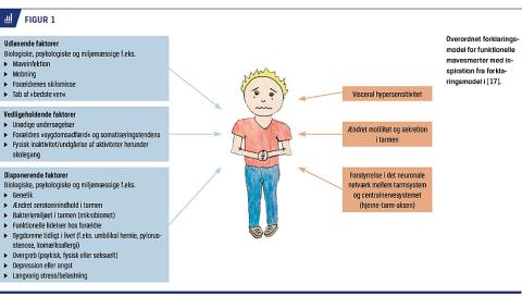 Ofte kan symptomerne debutere efter en periode med psykiske belastninger såsom familiære problemer, tab af »bedste ven«, udfordringer i skolen eller overgreb. FAPD kan også udvikles efter en ellers veloverstået maveinfektion. Symptomerne skyldes formentlig en kombination af visceral hypersensitivitet, ændret motilitet i tarmen og forstyrrelser i den såkaldte hjerne-tarm-akse. En ofte anvendt forklaringsmodel er, at der er kommet »uorden i systemet«, hvor hjernen overtolker signalerne fra tarmen, som samtidig er blevet mere følsom, hvilket fører til smerter. Samtidig kan ændret motilitet og sekretion resultere i ændret afføringskonsistens og -frekvens (diarré/forstoppelse), oppustethed og andre symptomer (Figur 1) [16, 17].