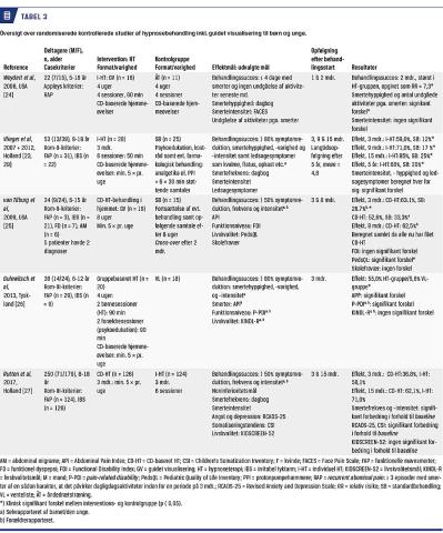 Ved en systematisk litteratursøgning i databaserne PubMed, Embase, Psychinfo og Cochrane for perioden 2000-2017 identificerede vi i alt fem randomiserede kontrollerede studier (RCT) med HT-behandling (inklusive guidet visualisering) af børn og unge med FAPD [23-27].