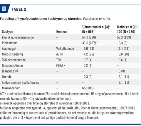 Klinisk nonsecernerende HA har en incidens på 1,8/100.000 [3, 6] (Tabel 2). Klinisk nonsecernerende HA udgår hyppigst fra de gonadotrope celler, men både GH, ACTH, TSH og meget sjældent prolaktin kan give anledning til et såkaldt »silent«-HA mht. hormonhypersekretion. Klinisk nonsecernerende makroadenomer kan påvirke den intakte hypofyses normale funktion med hormonel hyposekretion og/eller give udfald i synsfeltet pga. tryk [9]. Prolaktinniveauet kan være forhøjet ved klinisk nonsecernerende HA, da specielt et makro-, men også et mikroadenom kan reducere dopaminhæmningen af prolaktin.