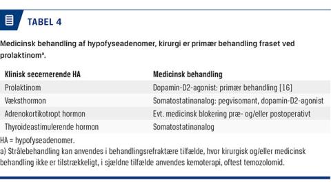 Medicinsk behandling med dopamin-D2-receptoragonist er førstevalg ved prolaktinomer [16]. Kirurgisk behandling og/eller strålebehandling er forbeholdt de få komplicerede tilfælde, hvor dopamin-D2-agonistbehandling ikke tåles og/eller ikke er virksom (Tabel 4). Medicinsk behandling kan dog også tilbydes visse patienter med andre typer HA, hvis de ikke ønsker eller tåler kirurgi (Tabel 4). Den medicinske behandling er desværre ikke uden bivirkninger, hvorfor kirurgisk intervention fortsat er førstevalget (fraset ved prolaktinomer). Efter operation for et klinisk secernerende HA