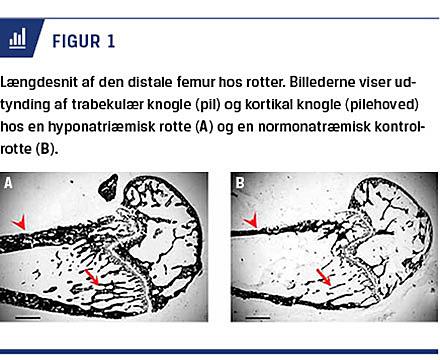 Resultaterne af en række cellekultur- og dyreforsøg støtter hypotesen om, at hyponatriæmi har en direkte skadelig effekt på knoglemasse og omsætning. Verbalis et al fandt en 30% reduktion i BMD hos rotter efter tre måneder med svær hyponatriæmi, som var blevet fremkaldt af infusion af desmopressin og flydende kost (Figur 1) [18]. Barsony et al fandt tilsvarende, at der var en dosis-respons-sammenhæng mellem faldende P-natriumniveau og øget osteoklastantal og -aktivitet. For at udelukke at effekten var medieret af en lav osmolaritet, blev denne korrigeret med mannitol. Korrektionen førte til øget osteoklastantal og -aktivitet, hvilket indikerer, at natriumkoncentrationen frem for osmolariteten er vigtig for knoglepåvirkningen. Sekundær hyperparatyroidisme blev udelukket ved injektion af D-vitamin. Yderligere viste gruppen, at hyponatriæmiske rotter tabte knoglemasse langt hurtigere end de normonatriæmiske, og at natriumindholdet i knoglerne var lavest hos rotter med hyponatriæmi [19]. Gruppens seneste arbejde viste, at hyponatriæmi førte til ændringer i genekspressionen i både osteoklaster og nerveceller, hvilket muligvis kan forklare udviklingen af osteoporose og neurologiske deficit hos hyponatriæmiske patienter [20].