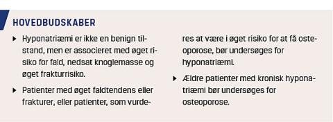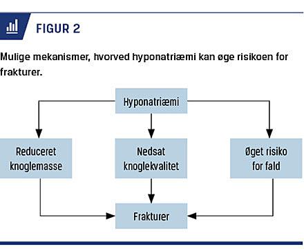 risiko for både fald og frakturer [12]. Den forøgede risiko for frakturer persisterede efter justering for fald. Jamal et al fandt tilsvarende både en signifikant øget forekomst af fald og en nedsat knoglemasse hos patienter med hyponatriæmi, men også disse patienters øgede frakturrisiko var uafhængig af forskelle i BMD og faldtendens. Begge studier viste en signifikant øget risiko for vertebrale frakturer, som typisk ikke er relateret til fald.