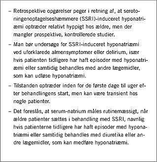 Som de traditionelle antidepressiva kan SSRI medføre hyponatriæmi. Ved hyponatriæmi forstås serum-natrium (S-Na) under 135 mmol/l. Der er stor og individuel variation i symptomerne, der som hovedregel ikke optræder før S-Na falder til under 130 mmol/l. Symptomerne inkluderer almen utilpashed, kvalme, delirium og neurologiske deficit og kan derved give anledning til differentialdiagnostiske problemer. Lægemiddelstyrelsens Bivirkningsnævn modtog i perioden 1997 til 2002 i alt 879 rapporter om 1.227 bivirkninger til SSRI, hvor kausaliteten blev bedømt som mulig, sandsynlig eller sikker. I alt 19 af disse omhandlede hyponatriæmi. Hyponatriæmi er en potentiel bivirkning ved alle SSRI, som er markedsført i Danmark [1-3]. I Lægemiddelkataloget (www.lk-online.dk) angives, at hyponatriæmi er en sjælden bivirkning ved SSRI, men retrospektive opgørelser tyder på, at denne bivirkning forekommer hyppigere hos visse patientgrupper, hvilket støttes af vores empiriske erfaring fra arbejdet i geriatrisk klinik.