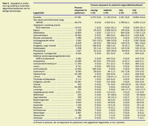 I 1999 blev der i alt udskrevet 2,8 mio. recepter til 311.859 personer i Fyns Amt; 1,5% (n = 41.322) af recepterne blev udskrevet til personer, hos hvem der forelå risiko for en lægemiddelinteraktion. I alt fandtes der 1.022 forskellige potentielle lægemiddelinteraktioner, 49 alvorlige, 796 moderate og 177 lette. I Tabel 2 vises forekomsten af potentielle lægemiddelinteraktioner hos patienter med polyfarmaci. De lægemidler, som hyppigst var involveret i potentielle lægemiddelinteraktioner, var diuretika, non steroid antiinflammatory drugs (NSAID), angiotensin converting enzyme (ACE)-hæmmere, digoxin, betablokkere, calciumblokkere, perorale antidiabetitika og antikoagulerende lægemidler.
