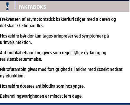 ABU forekommer med stigende hyppighed hos ældre og kan forvirre, hvis urinprøver tages uden mistanke om UVI. Desværre er symptomatologien ved UVI ofte vanskeliggjort hos ældre, der har svært ved at kommunikere. Ætiologien ved UVI hos ældre ændrer sig mod andre Enterobacteriaceae end E. coli og ofte med mere resistente bakterier. Urinprøvetagning til D + R er derfor vigtig som vejledning af antibiotikavalg. Varigheden af behandling hos ældre er længere end hos yngre. Husk, at bivirkningsfrekvensen ved antibiotikabehandling også er højere hos ældre, og interaktion med andre lægemidler er hyppigere pga. polyfarmaci.