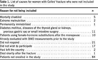 Discussion: There is a high probability of osteoporosis among women with Colles' fracture despite otherwise good health, particularly if they have previously had fractures possibly related to osteoporosis. It is recommended that this group of patients be referred for bone densitometry and subsequently prescribed appropriate medication.
