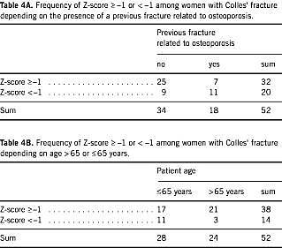 Hvis en patient havde en kendt tidligere fraktur, der kunne relateres til osteoporose, var der en 2,5 gange øget sandsynlighed for, at vedkommende tillige havde en Z-score < 1 (p < 0,02 (χ2 -test)) i enten hofterne eller i columna lumbalis i forhold til patienter uden tidligere osteoporoserelaterede frakturer (Tabel 4A ). Dog var det grænsesignifikant 2,5 gange sjældnere at finde en Z-score < -1 hos kvinder over 65 år i forhold til kvinder under 65 år (p = 0,058 (χ2 -test)) (Tabel 4B ). Der var ingen signifikante forskelle i hyppigheden af tidligere frakturer mellem de to aldersgrupper.