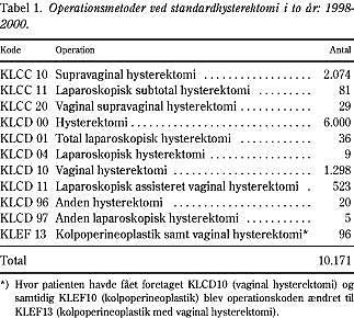 Analysen er foretaget ud fra en skabelon udviklet af Center for Evaluering og Medicinsk Teknologivurderings »Kirurgigruppe« (5). Evalueringen bygger på udtræk fra Landspatientregisteret (LPR) for en toårig periode (1.7.1998-30.6.2000) på samtlige hysterektomier foretaget på benign indikation samt indikationerne carcinoma in situ cervicis uteri og cancer corporis uteri stadium 1, hvor indgreb og det umiddelbart postoperative forløb forventes at være sammenlignelige. Operationskoderne, der blev anvendt som udgangspunkt for udtrækket, fremgår af Tabel 1 .