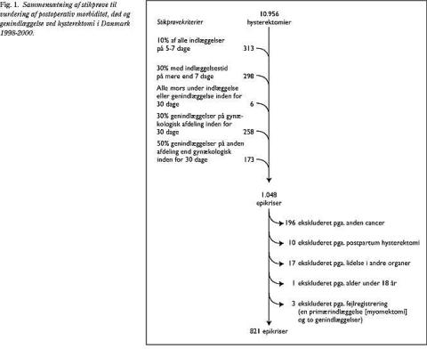LPR-udtrækket med i alt 10.956 hysterektomier blev renset for 49 hysterektomier med obstetriske operationsindikationer (fx akutte postpartum hysterektomier), for tre hysterektomier på kvinder under 18 år og for 25 hysterektomier foretaget på grund af lidelser uden for de kvindelige kønsorganer, hvor hysterektomi var tillægsoperation (fx operation pga. diverticulitis med absces medinddragende uterus). Fyrre patienter blev ekskluderet, fordi diagnosekoden ved fornyet henvendelse i løbet af 60 dage efter operationen blev ændret til en cancerdiagnose (ud over cancer corporis uteri st. I) - ud fra antagelsen om, at diagnosen blev ændret på baggrund af et forsinket mikroskopisvar. Derudover blev 667 hysterektomipatienter frasorteret pga. cancerdiagnoser ud over inklusionskriterierne. En patient blev ekskluderet, idet epikrisegennemgangen viste, at hun var myomektomeret. Efter ovenstående resterede 10.171 »standard«-hysterektomier i LPR-udtrækket. Der er ikke skelnet mellem de forskellige operationsindikationer fordelt på de forskellige operationstyper, ligesom der ikke er skelnet mellem hyster-ektomier med eller uden tillægsoperationer (fx vaginal hysterektomi med forvægsplastik).