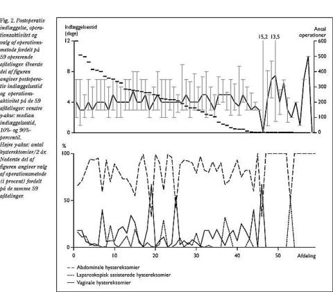 Den store variation i valg af operationsmetode er bemærkelsesværdig, idet andelen af vaginale hysterektomier på afdelinger med en operationsaktivitet på mere end 100/år varierer fra 0% til 67%. På samme måde varierer median postoperativ indlæggelsestid på afdelinger med mere end 100 hysterektomier årligt fra tre dage til 5,5 dage. Spredningen antyder, at optimering af de peri- og postoperative regimener med deraf følgende reduktion af indlæggelsestid ikke er gennemført, selv om det har vist sig muligt ved hysterektomi (3). Dette understreger nødvendigheden af udarbejdelse af fælles retningslinjer samt fortsat udvikling inden for området.