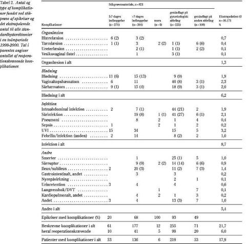 En komplikation fremgik af epikriserne hos 20% af patienterne indlagt mellem fem og syv døgn postoperativt og hos 68% ved indlæggelse i mere end syv døgn. 93% af genindlæggelserne på gynækologisk afdeling og 49% af genindlæggelserne på anden afdeling end gynækologisk skyldtes komplicerede forløb (Tabel 2 ). Ved indlæggelse fra 5-7 dage postoperativt fremgik det af epikriserne, at der var sket læsion på enten blære eller tarm hos syv patienter (2,6%). Hos fire patienter blev skaden repareret peroperativt, mens tre måtte reopereres. Ved indlæggelse i mere end syv dage fremgik organskade af 4,5% af epikriserne. De hyppigste årsager til genindlæggelse på gynækologisk afdeling inden for 30 dage var ifølge epikriserne: intraabdominal infektion (inkl. absces over vaginaltoppen) (17%), hæmatom over vaginaltoppen (16%), sårinfektion (16%) og smerter (10%) (Tabel 2).