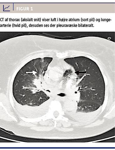En 55-årig kvinde med dissemineret ovariecancer blev indlagt febril og dyspnøisk. Hun fik foretaget CeCT af thorax og abdomen, for at man kunne vurdere, om det var tiltagende vækst af metastaser, der var årsag til hendes symptomer. 100 ml kontrastvæske (iomeprol 350 mg/ml) blev injiceret med en motorsprøjte gennem højre vena cubiti. Umiddelbart efter kontrastindgiften blev patienten urolig, klagede over dyspnø og blev snart ukontaktbar, respirations- og pulsløs. På mistanke om anafylaksi udløst af kontrastvæsken blev der givet 0,3 mg adrenalin intramuskulært, hvorefter patienten genvandt bevidstheden. Hun var konfus, havde lav iltmætning (85-93%) og hyperventilerede. Hun fik 100% ilt på ventilationsmaske, hvorefter de vitale værdier normaliseredes. På fortsat mistanke om en allergisk reaktion blev der givet 2 mg clemastin i.v. Ved akut gennemgang af skanningsbillederne sås der luft i højre overarmsvener, hjertet, a. pulmonalis og ud i de små lungearterier bilateralt (Figur 1). Patienten blev lagt i Trendelenburgs leje med let venstredrejning (Durants manøvre), men dette udløste stort ubehag, og hun blev igen lejret på ryggen. Hun var fortsat stabil, men mere dyspnøisk end før skanningen og blev derfor