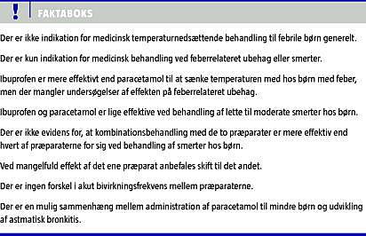 Summary Ibuprofen is more effective than paracetamol in lowering the temperature in febrile children Ugeskr Læger 2012;174(18):1214-1217 In Denmark, the traditional choice for treating fever and pain in children is paracetamol. In other countries is ibuprofen or a combination of paracetamol and ibuprofen preferred. The literature describing the two medications for children is being reviewed. It is concluded that ibuprofen seems to be more effective in reducing fever when compared to paracetamol. The two types of medications are equally effective when it comes to treating pain in children.